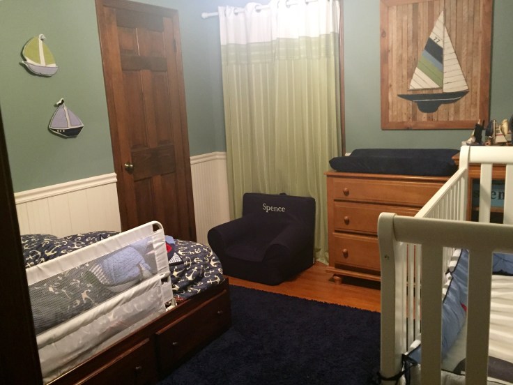 The scene. A big boy bed and crib in the same room–my son’s room. Do you see anything weird about it? Me either.